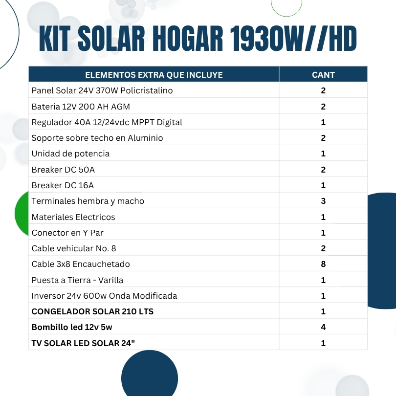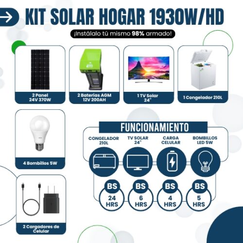 Descripción 1 Congelador 210 LTS ECO AMIGABLE de 40W 4 Bombillos 12V 5W LED de 5W 2 Cargador para celular de 7W cada uno 1 TV Solar 24″ LED de 45W ¡Haz clic para puntuar esta entrada! (Votos: 0 Promedio: 0)