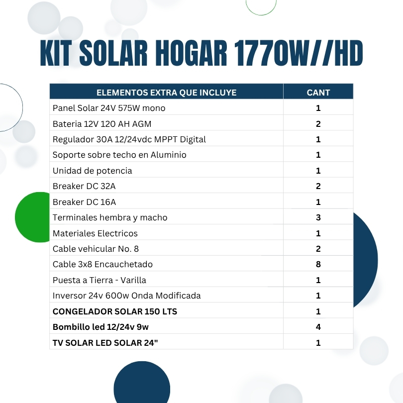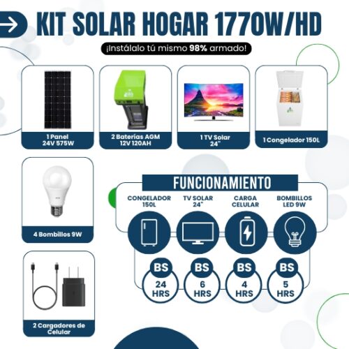 Descripción 1 Congelador 150 LTS SOLAR de 33W 4 Bombillos 12V 9W LED de 9W 2 Cargadores para celular de 7W cada uno 1 TV Solar 24″ LED de 40W ¡Haz clic para puntuar esta entrada! (Votos: 0 Promedio: 0)