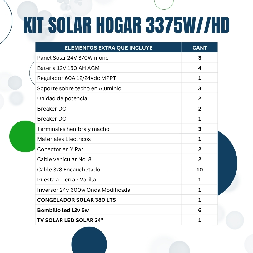 Descripción 1 Congelador 380 LTS ECO AMIGABLE de 72W 6 Bombillos 24V 7W LED de 7W 2 Cargadores para celular de 7W cada uno 1 TV Solar 24″ LED de 45W ¡Haz clic para puntuar esta entrada! (Votos: 0 Promedio: 0)