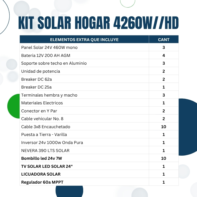 Descripción 1 Nevera de 390 LTS ECO BLUE de 72W 10 Bombillos 24V 7W LED de 7W 2 Cargadores para celular de 7W cada uno 1 TV Solar LED 24″ de 45W 1 Licuadora Solar de 210W ¡Haz clic para puntuar esta entrada! (Votos: 0 Promedio: 0)